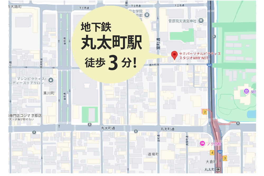 セミパーソナルピラティススタジオWHY NOT 京都烏丸丸太町店 〒602-8022 京都市上京区椹木町通室町東入養安町239 御所西篠 101号室 電話:075-201-0094 公式LINE Googleマップ